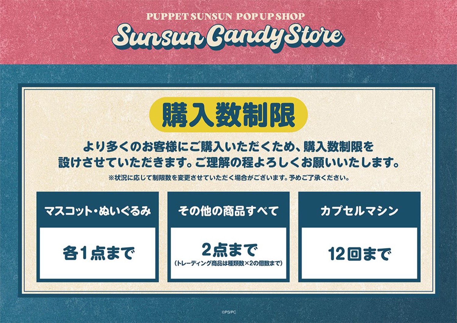 「パペットスンスン」ポップアップストアにて、グッズをお買い上げ3,000円(税込)以上でくじに1回参加できる。景品として「A賞: バルーン+ステッカー 全3種 (ステッカーはランダムで1枚)」、「B賞: ステッカー 全3種 (ランダムで1枚)」がラインナップする。