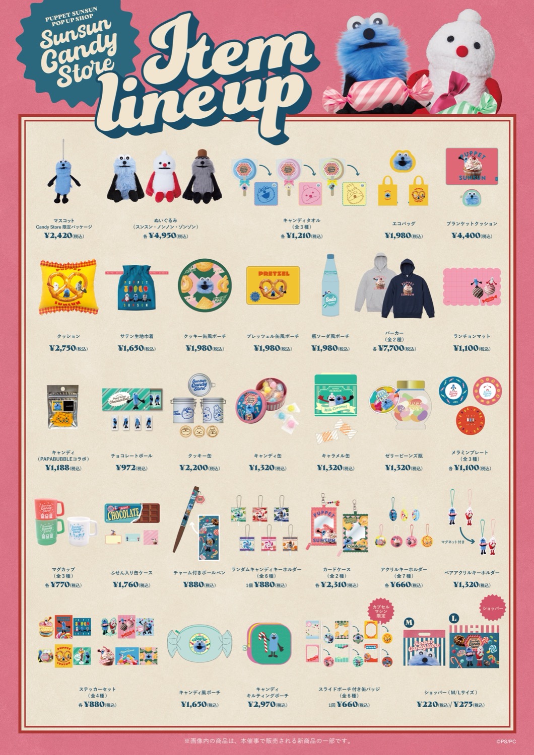 「パペットスンスン」ポップアップストアでは、スンスン・ノンノン・ゾンゾンたちの、”キャンディ”や”お菓子”をモチーフに描かれたデザインを使用した新作グッズが多数販売!
