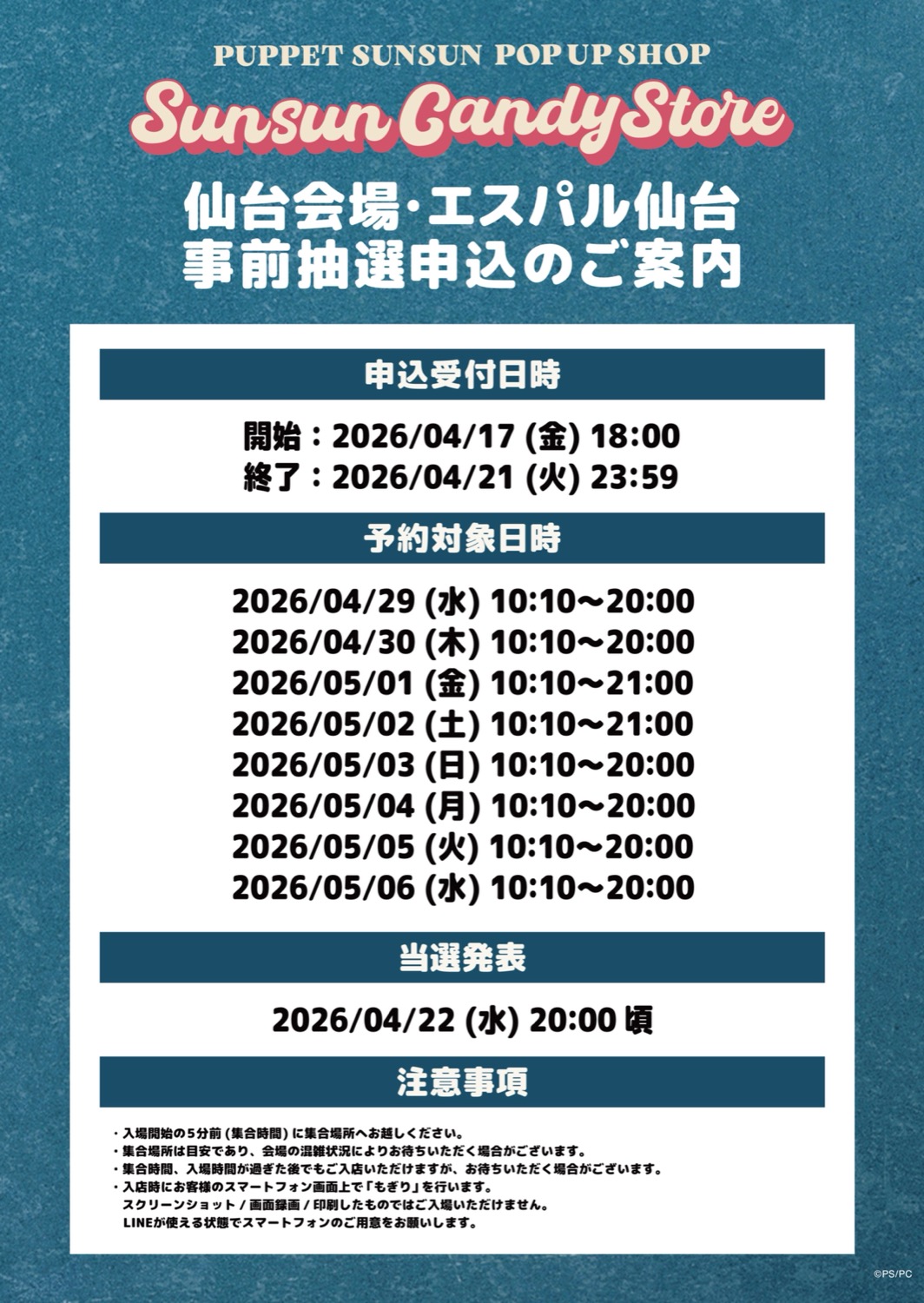 POP UP SHOPは混雑対応の為、mogilyでの予約制となります。… pic.twitter.com/btXEN8pNAw— SUNSUN Candy Store【POP UP SHOP】 (@sunsun_cs) April 14, 2026
