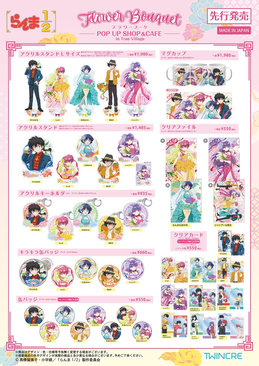 さらに”フラワーブーケ”をテーマに乱馬、らんま、あかね、良牙、シャンプーら人気キャラクター達を描き下ろした新規イラストの「アクリルスタンド」「マグカップ」「クリアファイル」などのコラボカフェ限定グッズも発売!