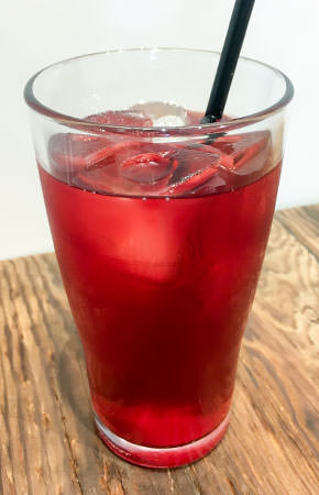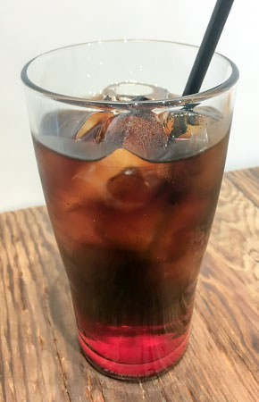 ブルーベリーシロップ×シトロンシロップ×コーラ 弥勒寺優夜をイメージした炭酸ドリンク。赤と黒の二層で衣装を、コーラの炭酸でラスボスキャラらしい強さを表現しました |