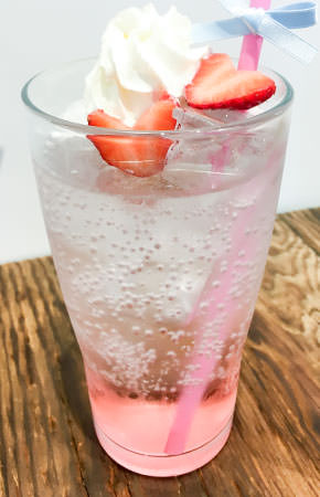| ピーチシロップ×サイダー×ホイップ×いちご まみかをイメージした甘いピーチサイダーにホイップとハート型のいちごトッピング。魔法少女姿のモチーフとして、ストローに水色のリボンを飾りました |