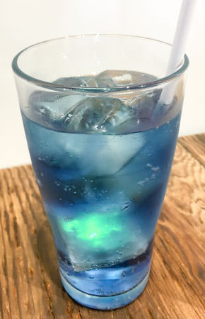 | ブルーキュラソーシロップ×ウォーターメロンシロップ×サイダー×ライトキューブ ブルーキュラソーシロップとウォーターメロンシロップの濃い青で鹿屋瑠偉の髪色を、緑色のライトキューブで鹿屋の使用機体ギガスマキナを表現しました |