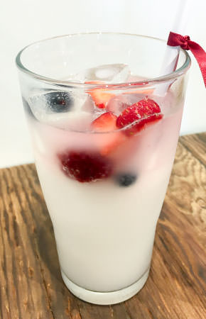 | カルピス×トニック×フローズンベリーミックス 軍服の姫君をイメージした炭酸ドリンク。カルピスとトニックウォーターで銀髪を、ベリーミックスで瞳の色を表現しました |
