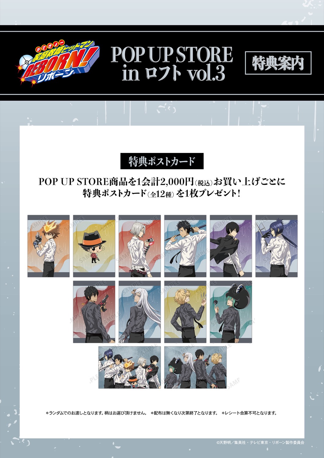 「家庭教師ヒットマンREBORN!」ポップアップストアにて、グッズをお買い上げ2,000円(税込)毎に特典として「ポストカード 全12種」がランダムに1枚プレゼントされる。