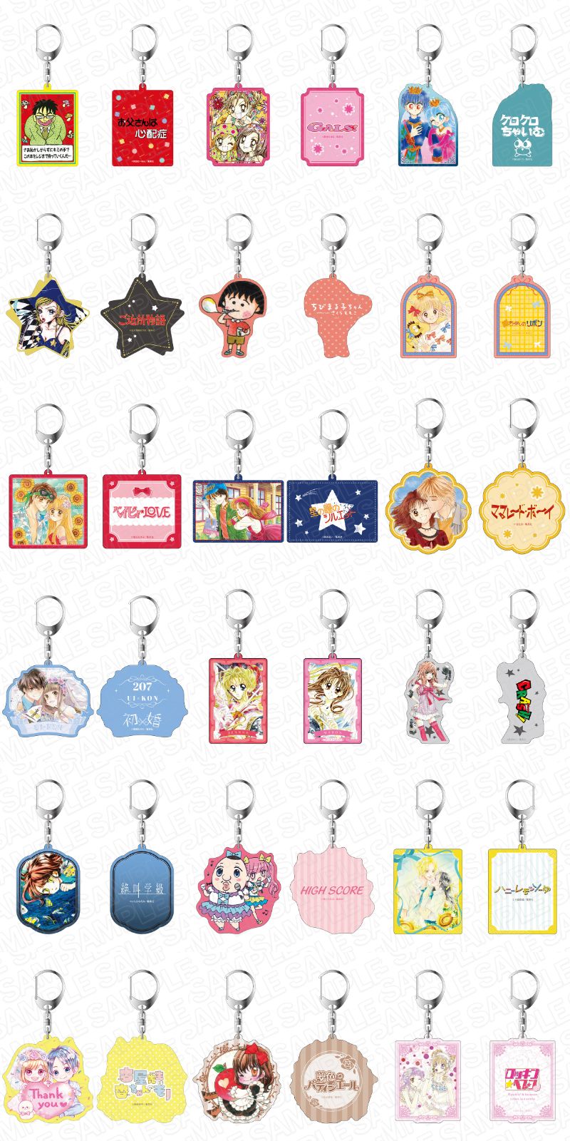 今も色褪せない、りぼん歴代名作漫画『全26作品』の原作イラストを使用した「両面キーホルダー」「ゆらゆらキーホルダー」「アクリルフィギュア」「アクリルプレート」など豪華11種類がラインナップ。