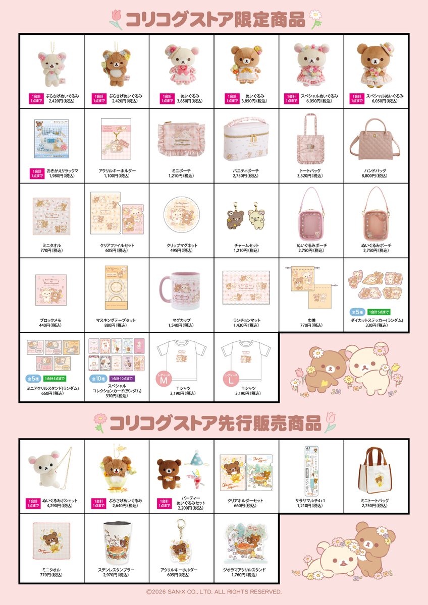 「リラックマ」ポップアップストアでは、お花畑で見つけた花を両手いっぱいに抱える、チャイロイコグマ・コリラックマのビジュアルを使用したグッズが多数販売される。