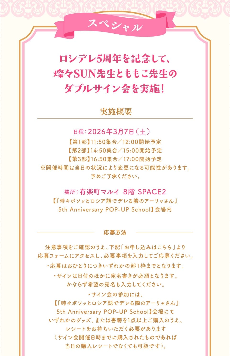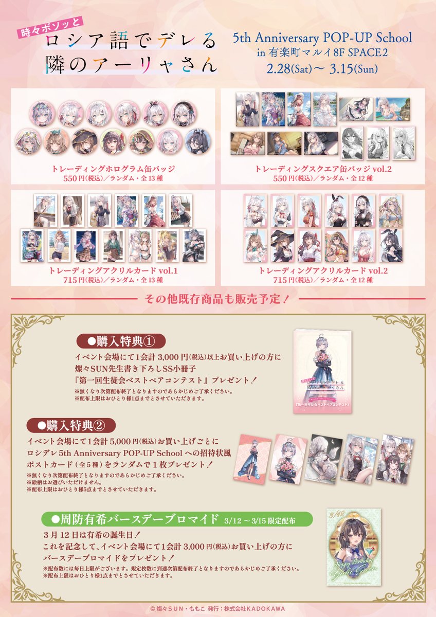 「『時々ボソッとロシア語でデレる隣のアーリャさん』5th Anniversary POP-UP School」にて、3,000円(税込)以上購入すると燦々SUN先生書き下ろしSS小冊子「第一回生徒会ベストペアコンテスト」をプレゼント!