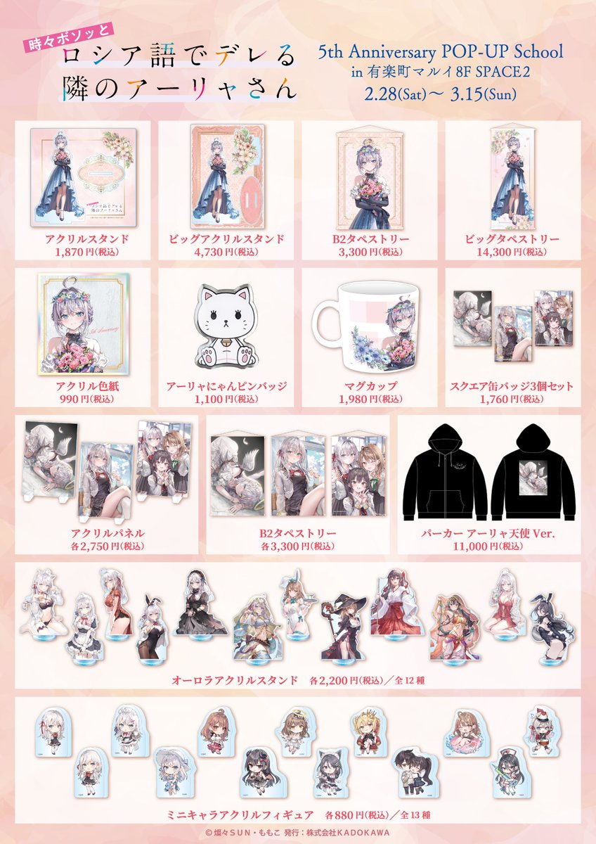 「『時々ボソッとロシア語でデレる隣のアーリャさん』5th Anniversary POP-UP School」では、アーリャがきらびやかなドレスに身を包む、5周年を記念した描き下ろしイラストの新作グッズが多数ラインナップ!