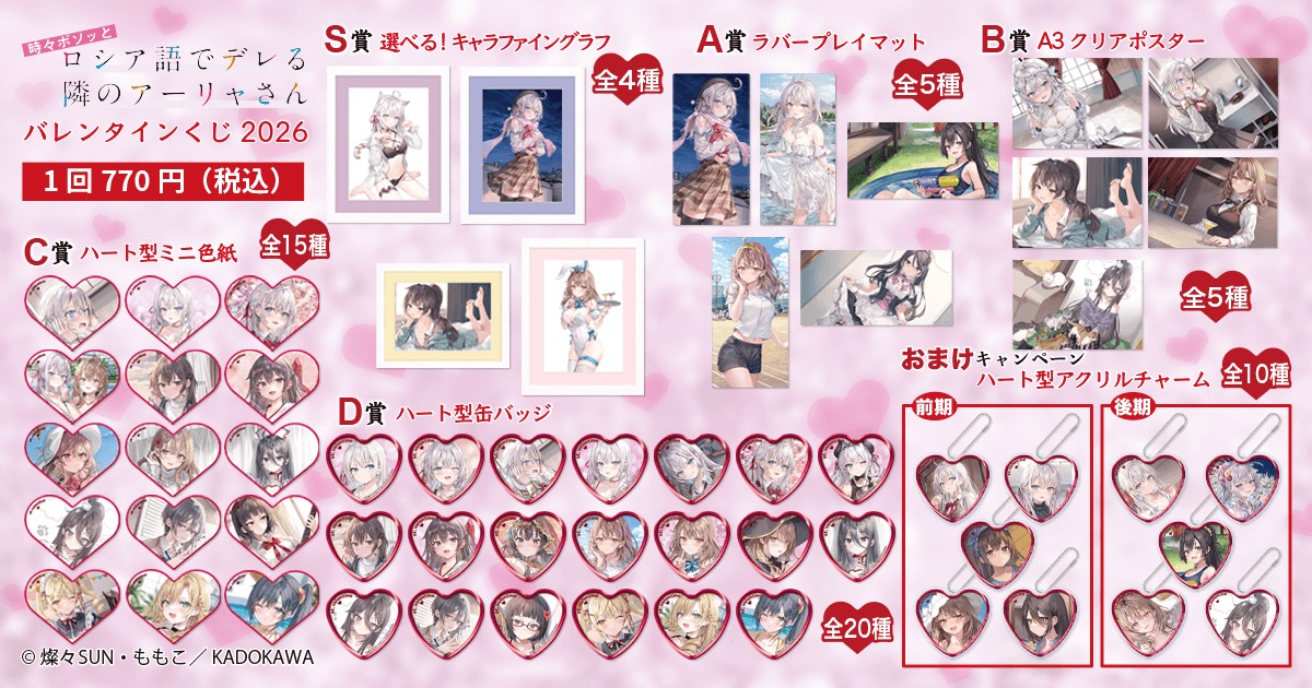燦々SUN先生によるシリーズ累計500万部突破の「時々ボソッとロシア語でデレる隣のアーリャさん (ロシデレ)」× くじ引き堂によるくじグッズ「『時々ボソッとロシア語でデレる隣のアーリャさん』バレンタインくじ2026」が、2026年2月14日12時〜3月10日11時59分までの期間限定で販売される。