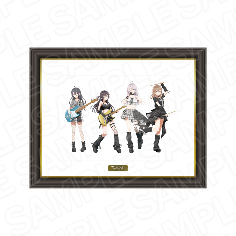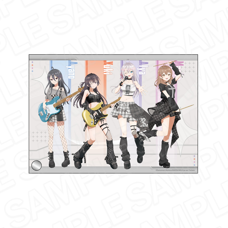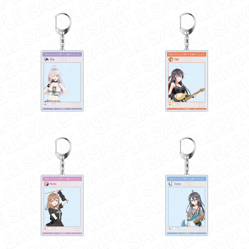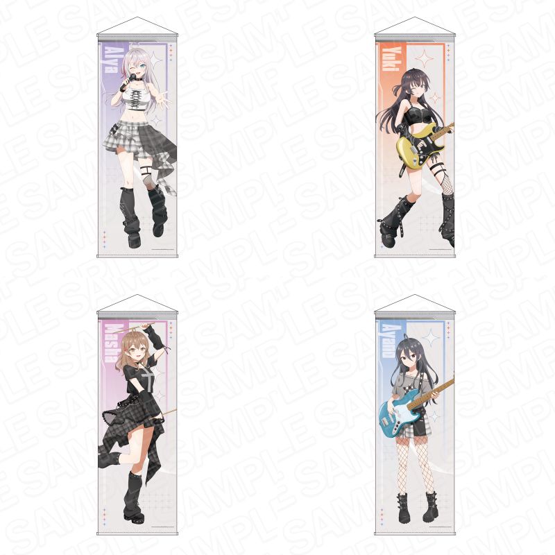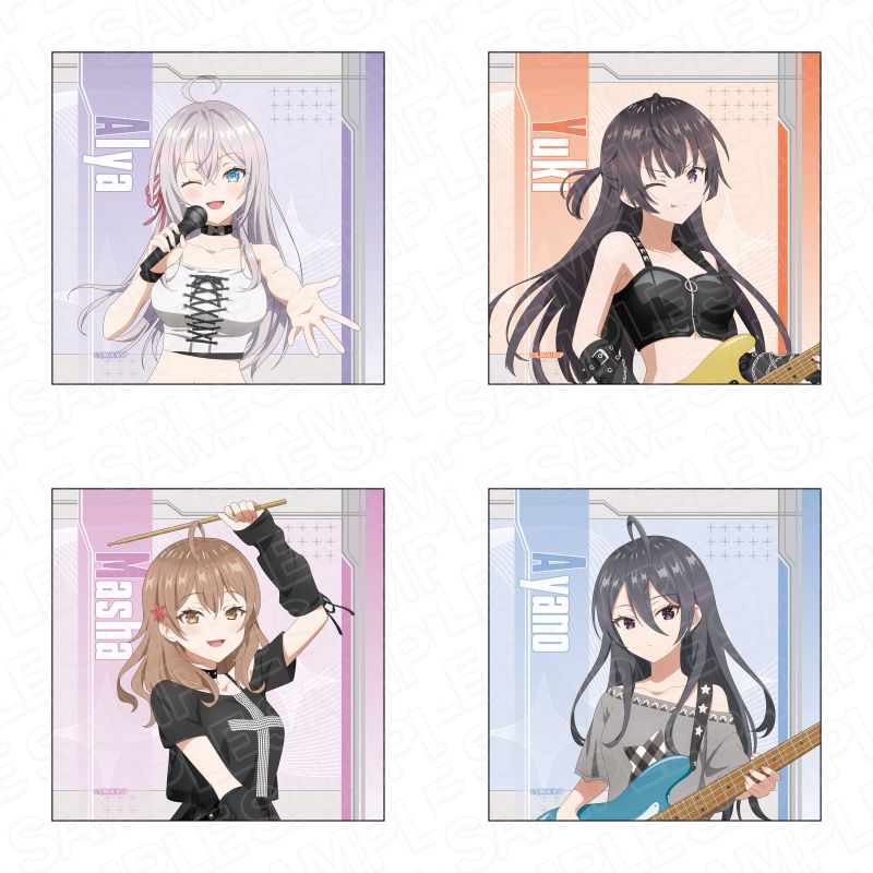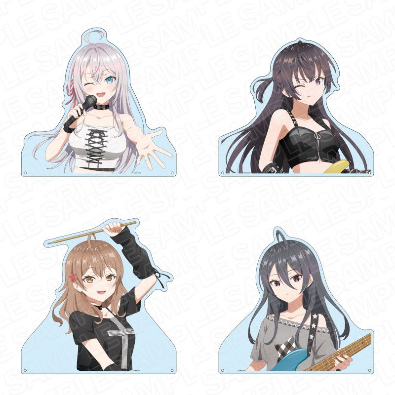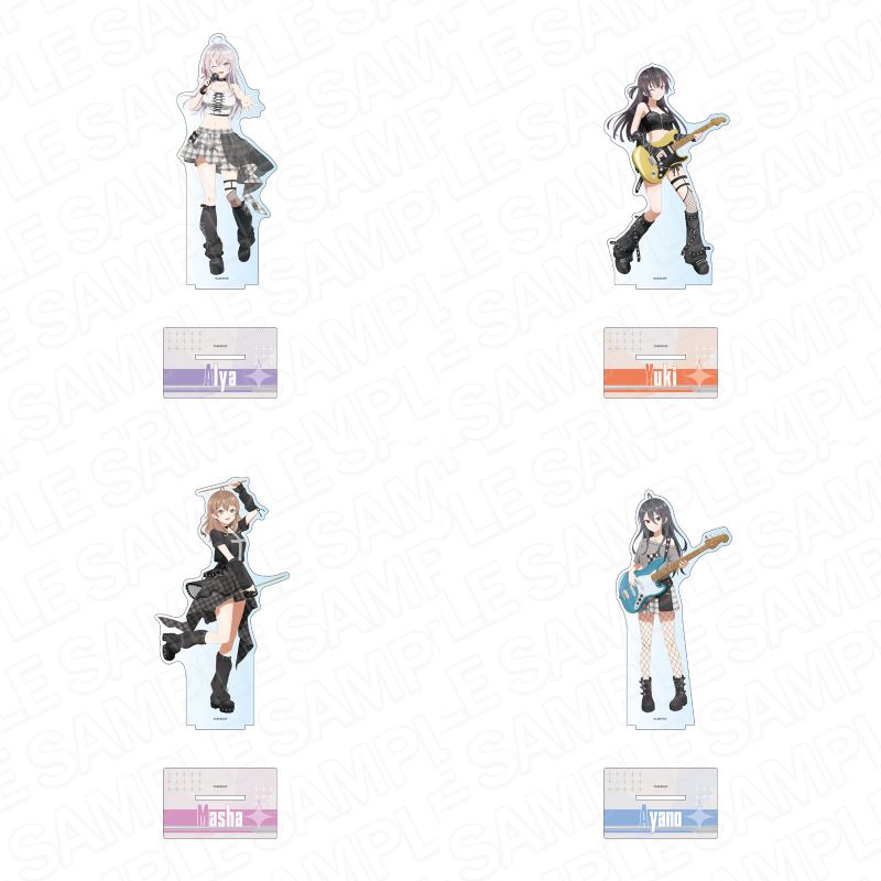 ガールズバンド風衣装に身を包んだ、アーリャ、周防有希、マーシャ、君嶋綾乃ら4人を描いた「SNS風アクリルキーホルダー」「デカアクリルスタンド」「ミニアクリルアート」「特大タペストリー」など全9種がラインナップ。