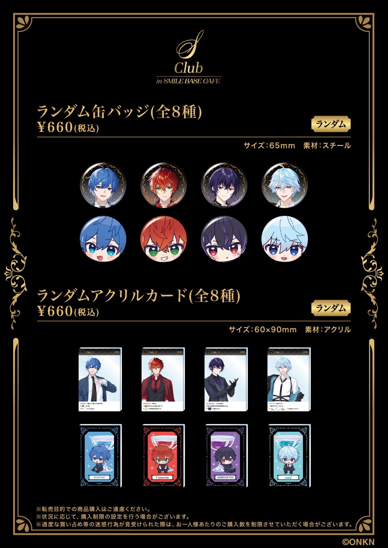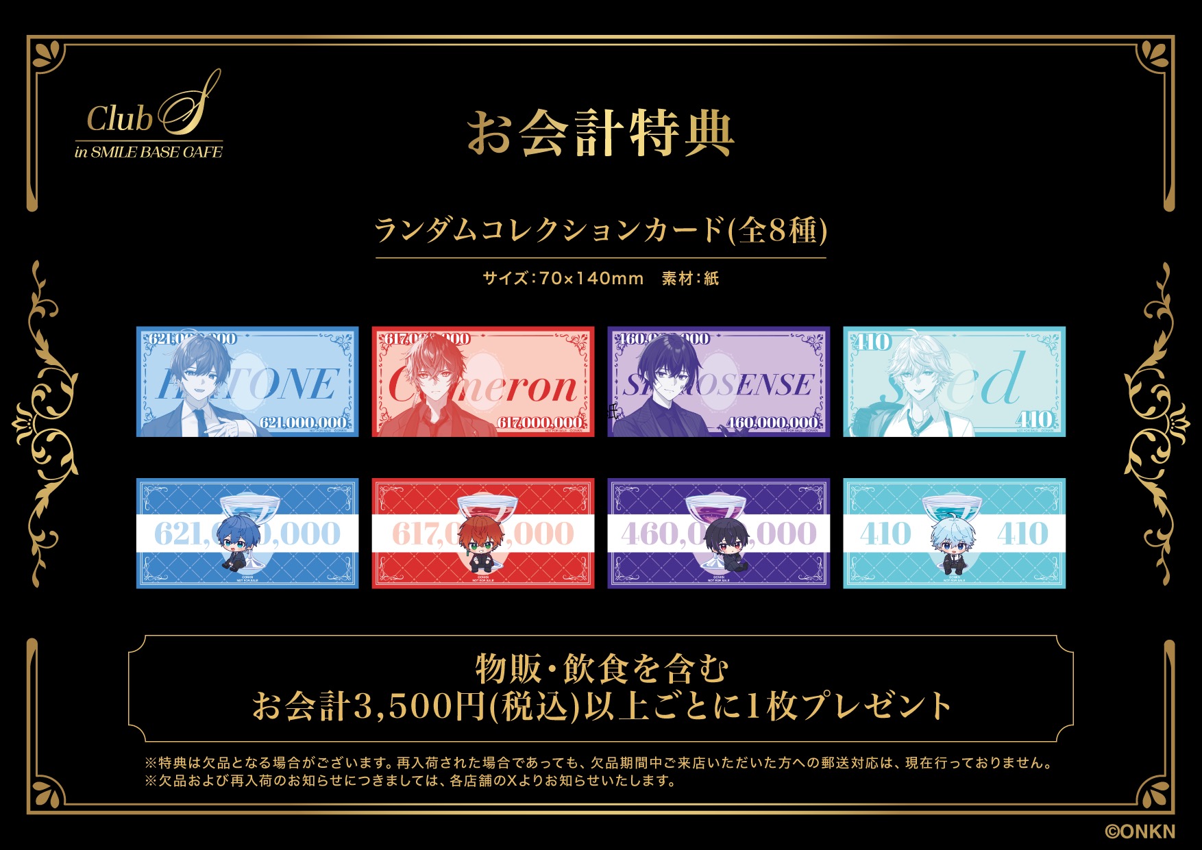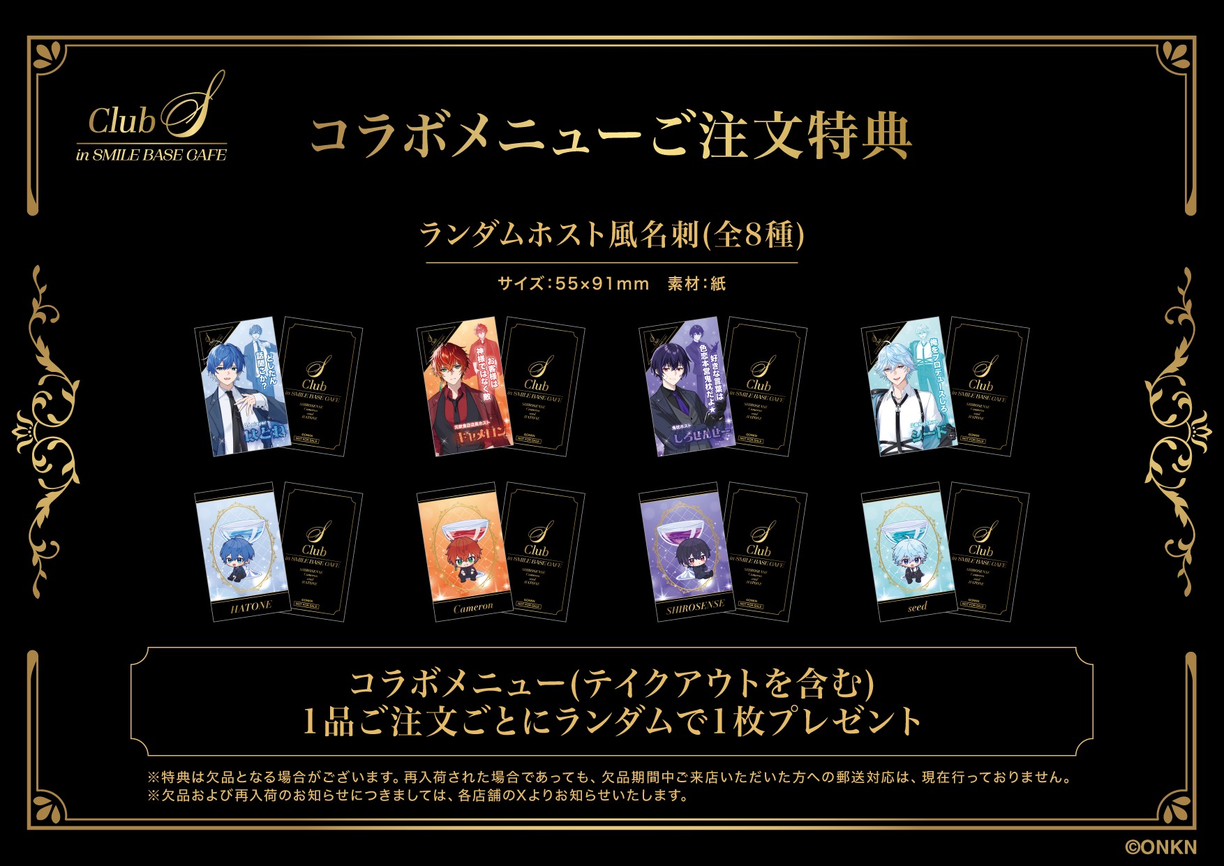 「最強無敵連合 × SMILE BASE CAFE 池袋/名古屋」コラボにて、コラボメニューを1品注文するごとに特典として「ホスト風名刺 (全8種)」をランダムに1枚、お会計金額 3,500円(税込)ごとに「コレクションカード (全8種)」をランダムに1枚プレゼント!