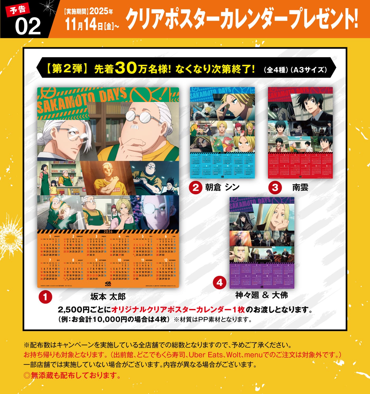 2025年10月31日より全国のくら寿司にて開催される「SAKAMOTO DAYS」キャンペーンでは、店内利用2,500円(税込)ごとに、描き下ろしイラストをデザインしたクリアファイルやクリアポスターカレンダーなどの特典をプレゼント。
