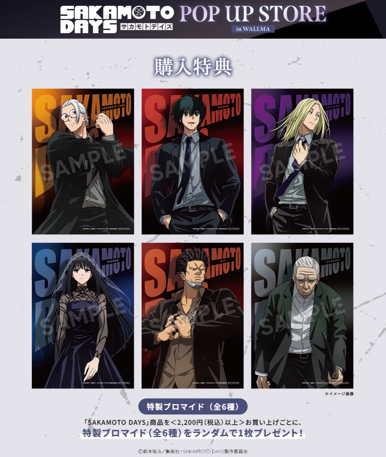 「SAKAMOTO DAYS」ポップアップストアにて、グッズをお買い上げ2,200円毎に特典として「ブロマイド 全6種」がランダムに1枚プレゼントされる。