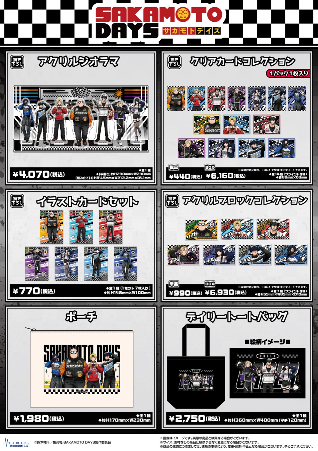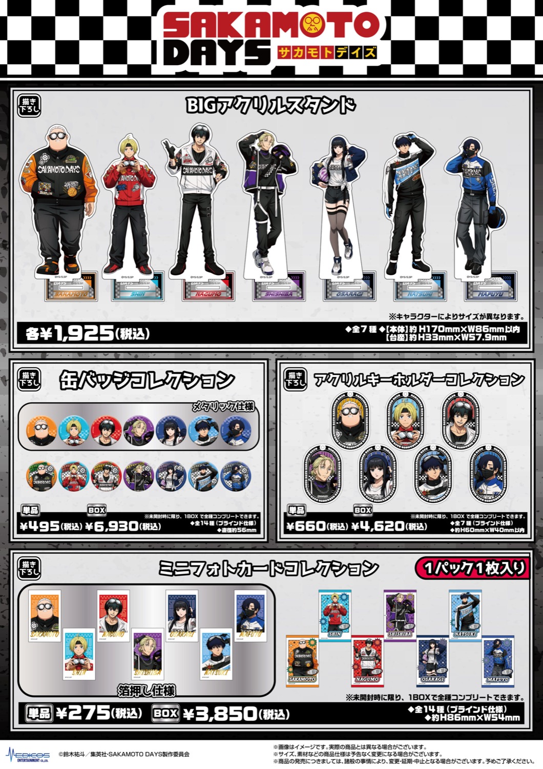 アニメ「SAKAMOTO DAYS (サカモトデイズ)」ポップアップストアでは、「レーサー」をテーマに描かれた坂本太郎・朝倉シン・大佛・神々廻・勢羽真冬・勢羽夏生たちの、描き下ろしイラストを使用した新作グッズが多数販売!