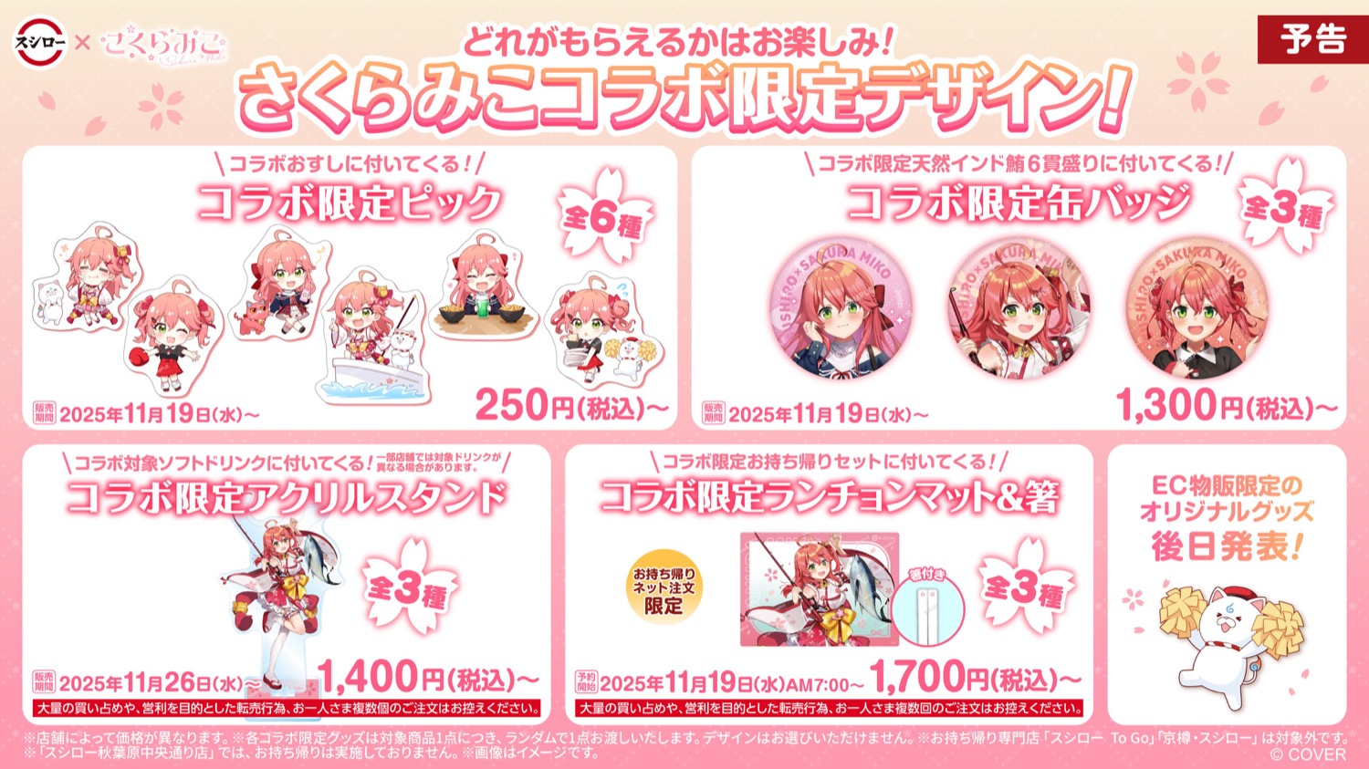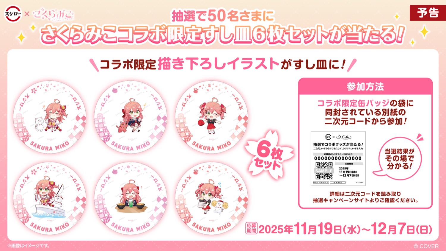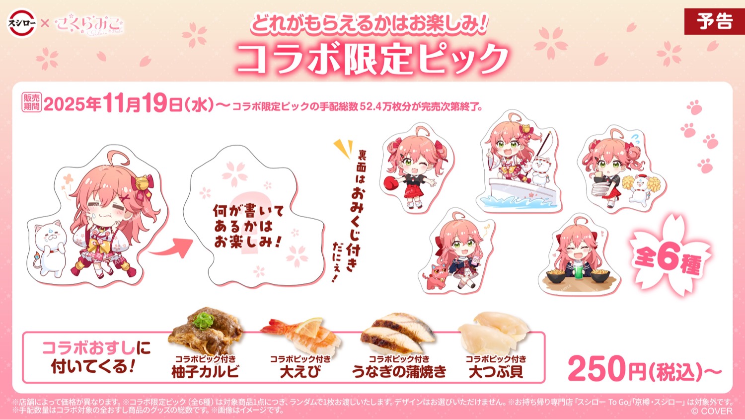 2025年11月19日より全国のスシローにて開催される「さくらみこ」コラボキャンペーンでは、コラボ限定ピック付きおすしなど、楽しいコラボが盛りだくさん!