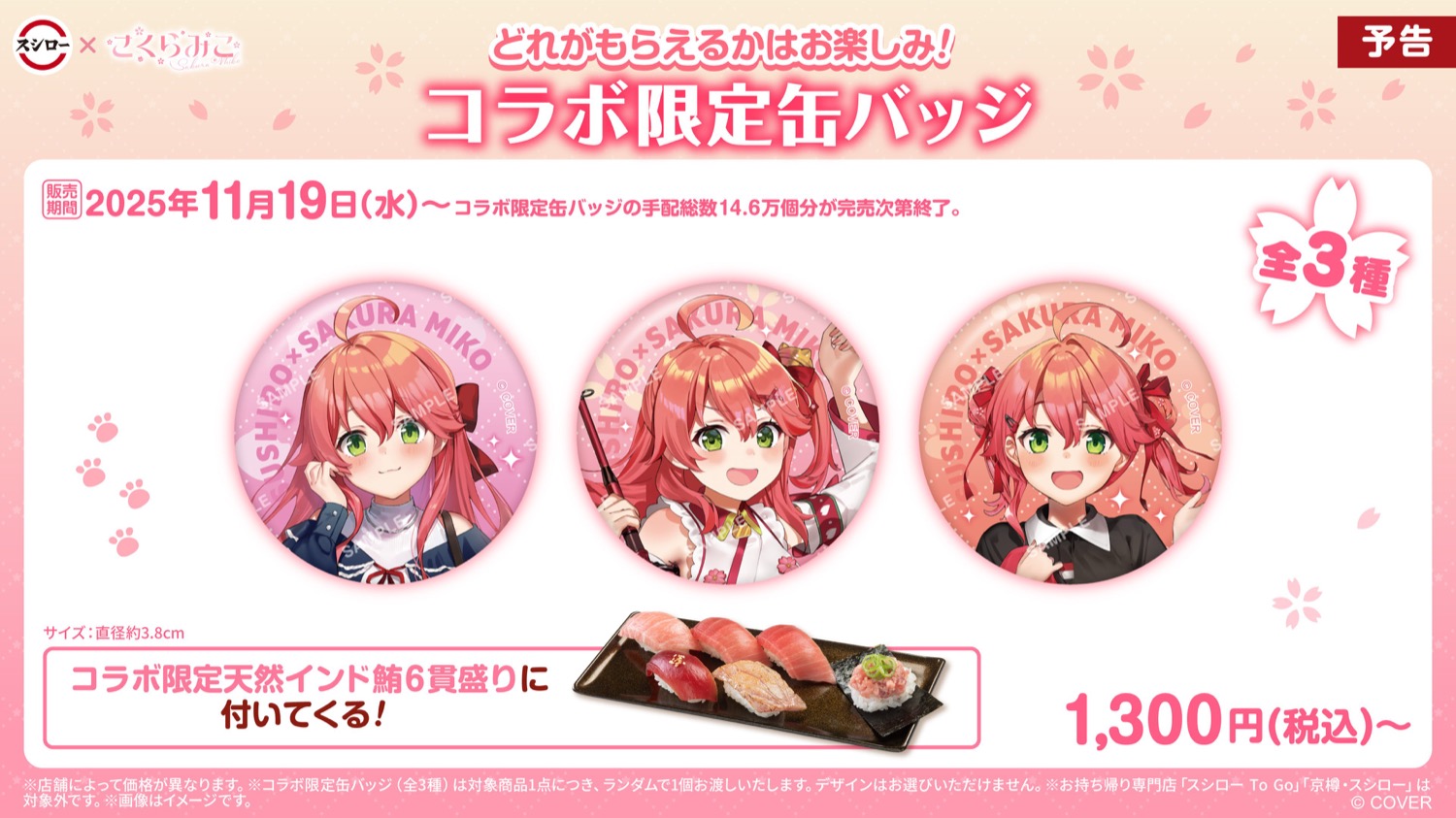 大人気バーチャルYouTuber事務所「ホロライブプロダクション」に0期生として所属する「さくらみこ」× スシロー全国にて、2025年11月19日〜12月7日までイベント名が開催される。