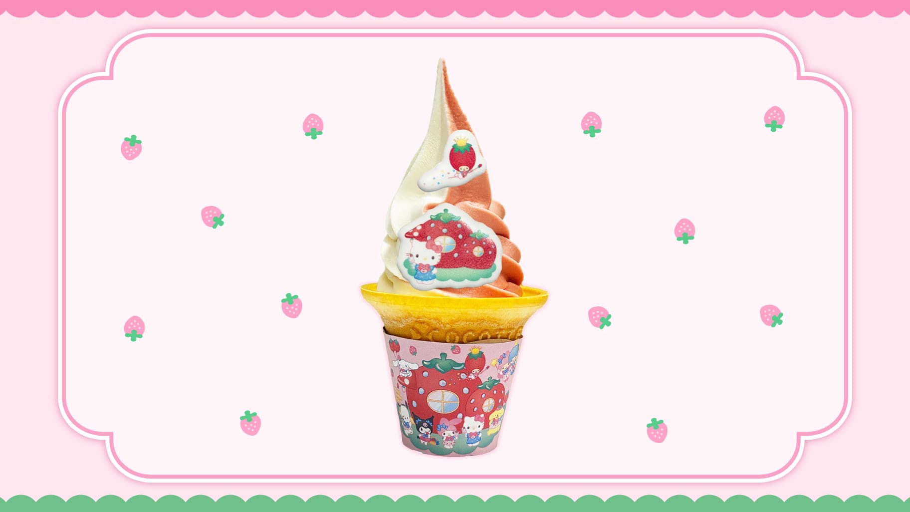 「いちごのお家」オープン期間中、ダイバーシティ東京 プラザ 2Fの「HELLO KITTYのこんがりやき」に、いちごのお家スペシャルバージョンのソフトクリームが登場!