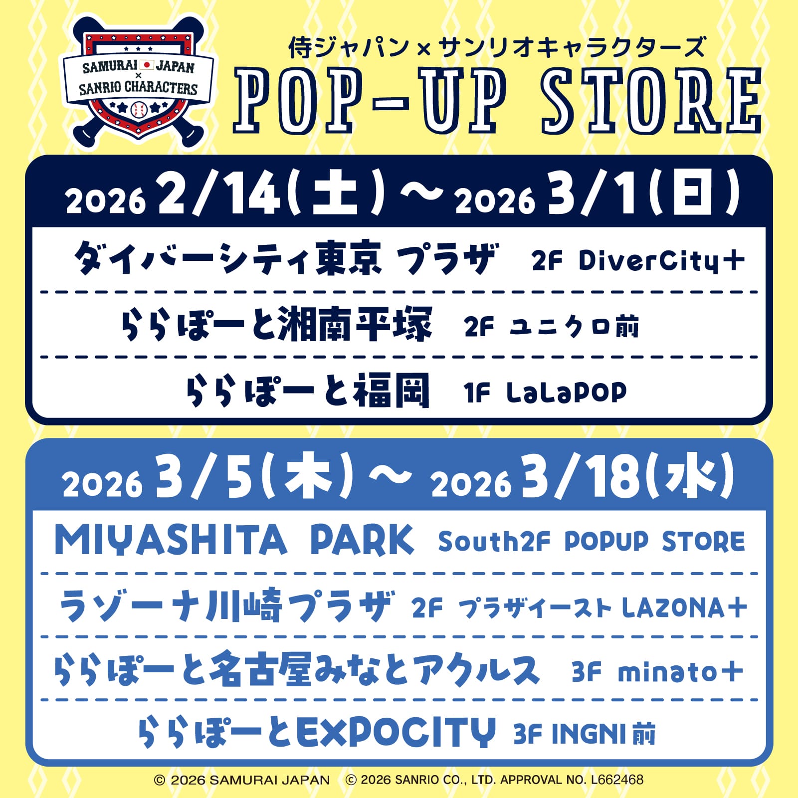 2026年2月14日より、全国7か所にて「サンリオ × 侍ジャパン」の描き下ろしグッズを販売するポップアップストアを実施!