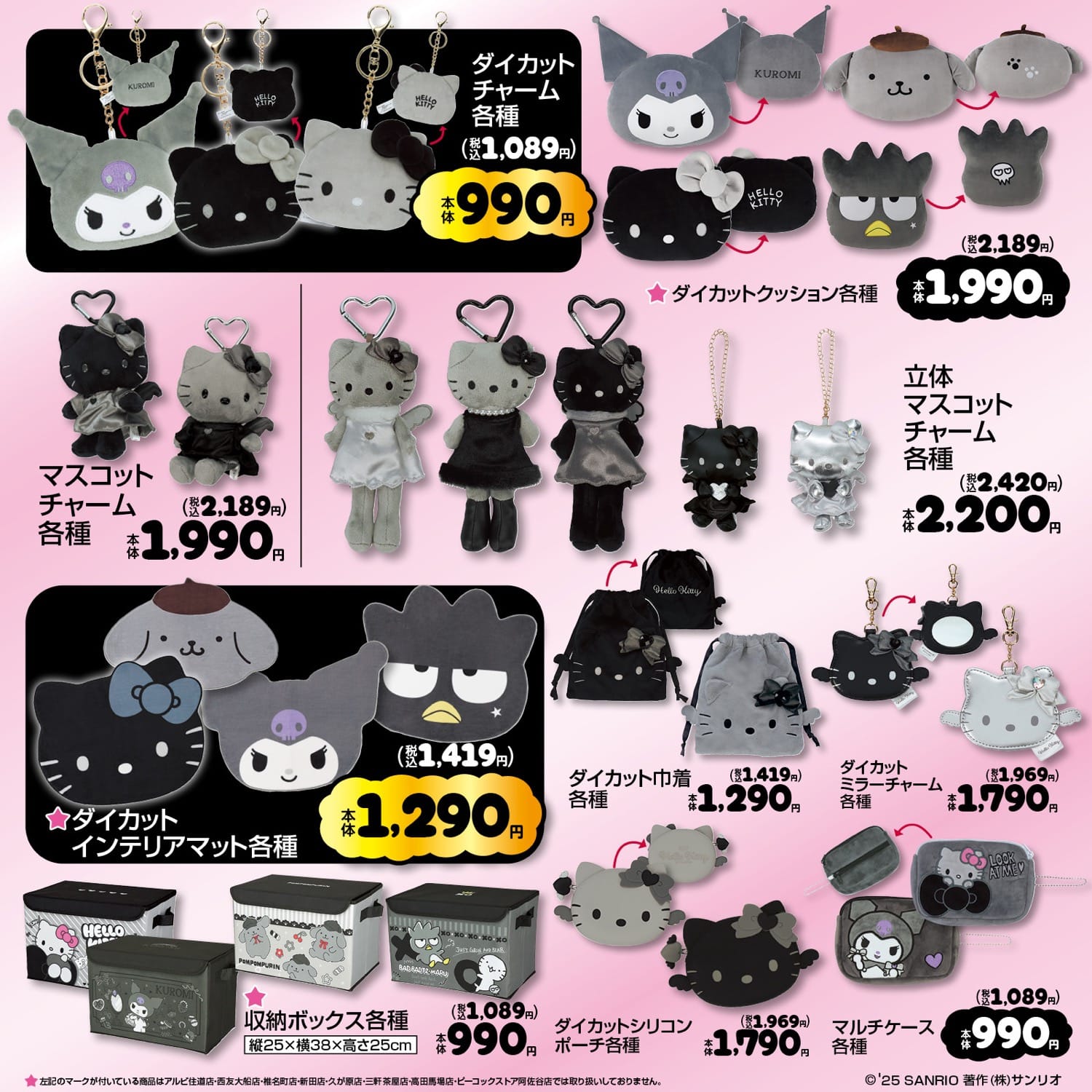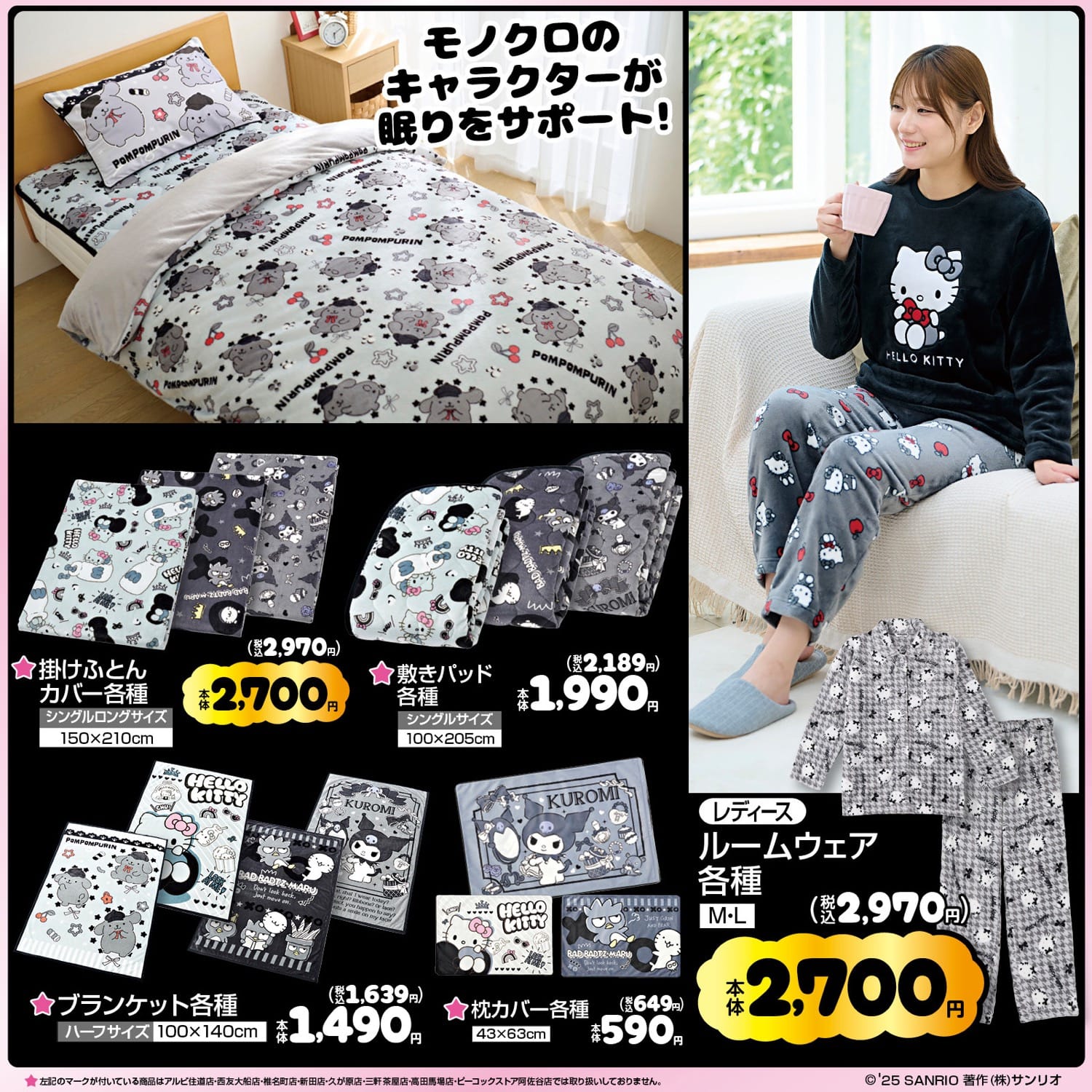 「サンリオキャラクターズ × しまむら」では、ブラックフライデーにちなんだモノクロのアパレルアイテムや日用雑貨が多数ラインナップ!