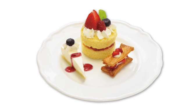 レアチーズケーキ+ブルーベリーソース+スポンジ+イチゴジャム+イチゴ+ホイップクリーム+ブルーベリー+ラズベリー+パイ+カスタードクリーム+ミント