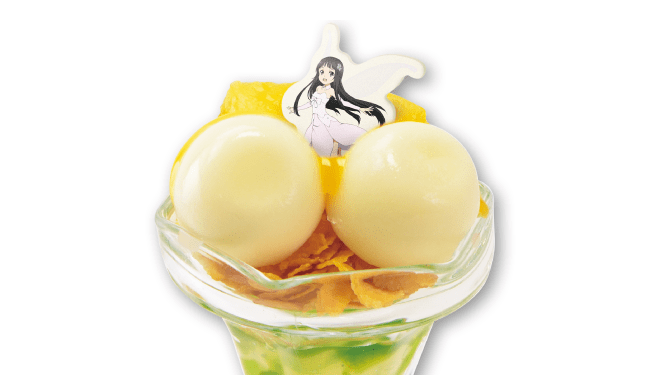 メロン+寒天+メロンソース+コーンフレーク+餅アイス+パインマンゴーケーキ+ホイップクリーム+マンゴーソース+もなか