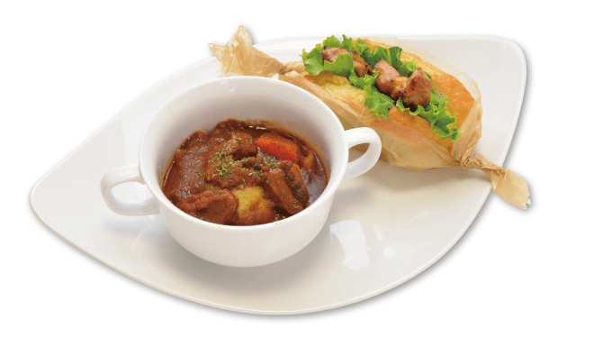 ビーフシチュー(牛肉+人参+玉ねぎ+じゃがいも+ペンネ)サンドイッチ(照り焼きチキン+バゲット+フリルレタス)