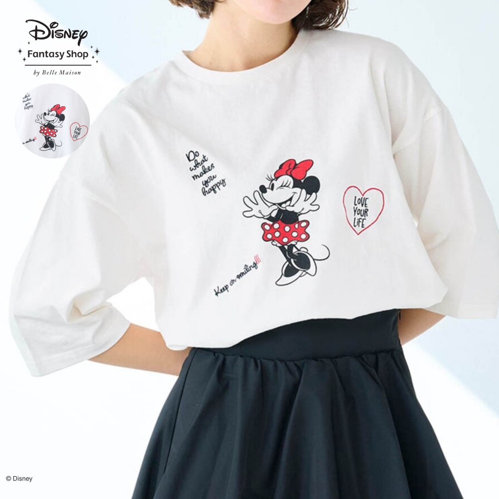 「ミニーマウス」のプリントとメッセージ刺繍が特徴。気になる二の腕をカバーする5分袖で、綿100%素材の優しい肌あたりが魅力です。