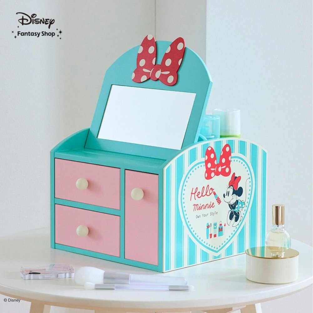 大きなリボンとビビットな配色が印象的なデザイン。3杯の引出しにメイク道具をたっぷり収納でき、好きな場所へ持ち運んでメイクが楽しめます。