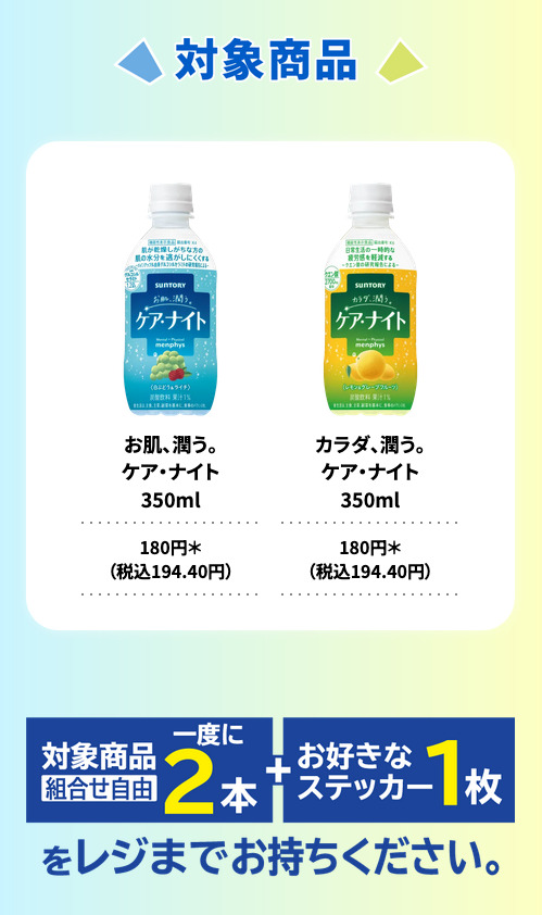 2025年11月25日より全国のセブンイレブンにて、対象の『サントリーケア・ナイト』商品2本と「PetiTEEN オリジナルステッカー 全13種」よりお好きなデザインを1つレジまで持って行き、対象商品を購入すると、セブンイレブン限定の「PetiTEEN」景品をプレゼント!
