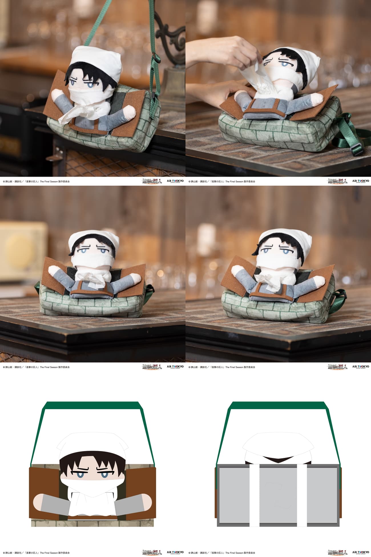 リールの伸びる動きが兵団の飛翔を彷彿とさせる「リールキーホルダー」や、掃除スタイルのリヴァイが厩舎の窓を開ける姿を模した「ティッシュケース」がラインナップ。