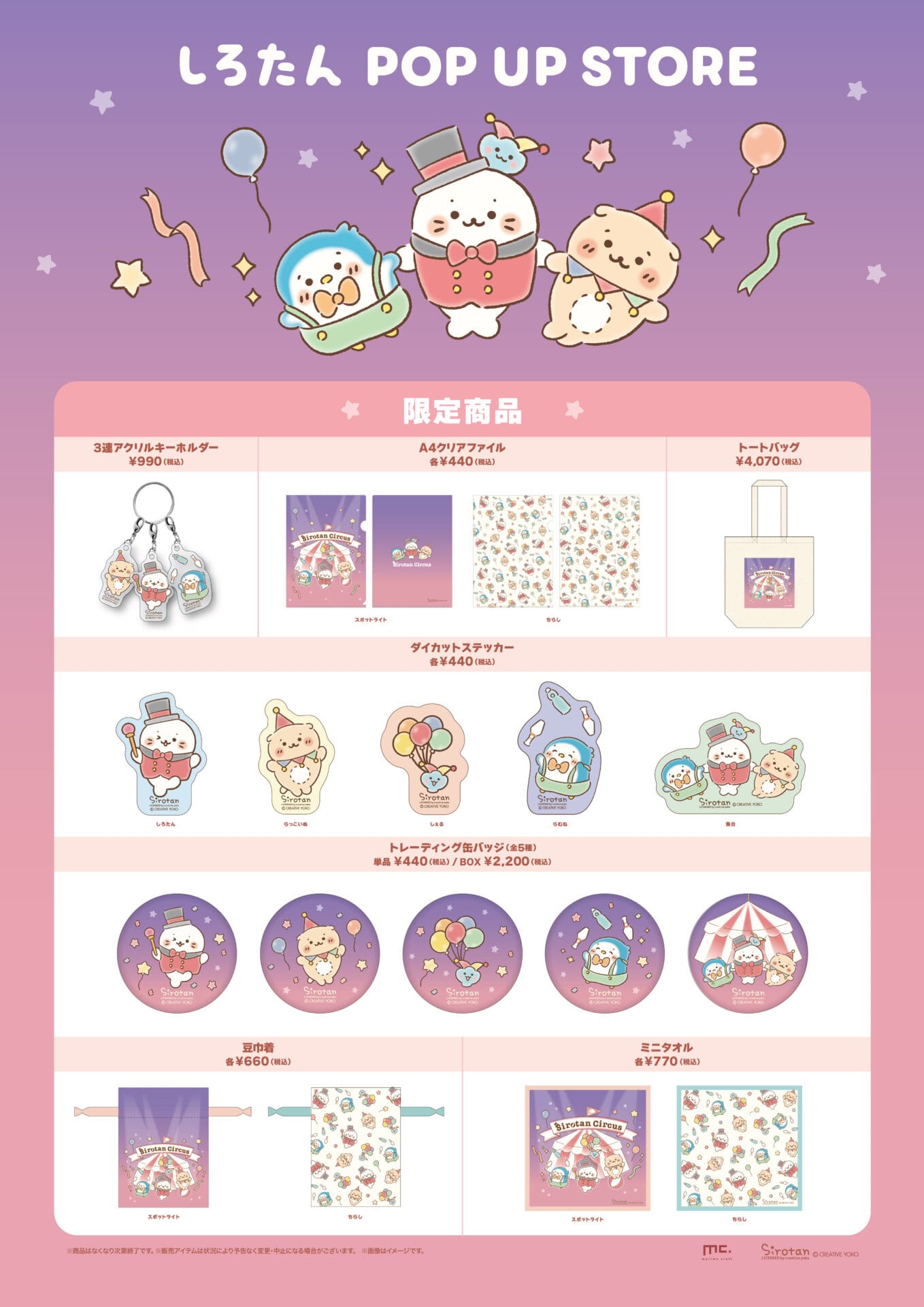 「しろたん」ポップアップストアでは、サーカスがモチーフの可愛い描き下ろしイラストを使用した新作グッズや店舗限定アイテムなど、多数のグッズが販売される。