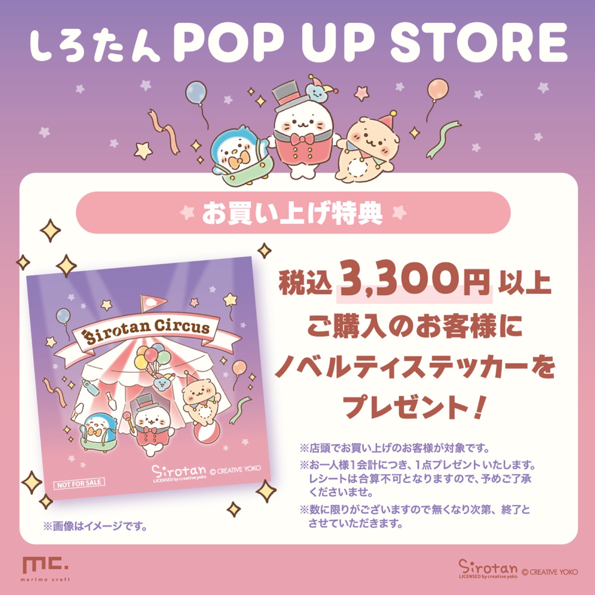 さらに、グッズを3,300円(税込)以上購入した方には、特典として描き下ろしノベルティ「ステッカー」を1枚プレゼント!