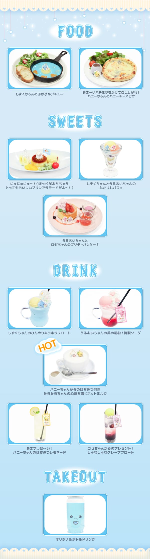 赤ちゃんver.のしずくちゃん、うるおいちゃん、みるみるちゃん、ハニーちゃん、ロゼちゃんらをイメージしたコラボメニューがラインナップ!