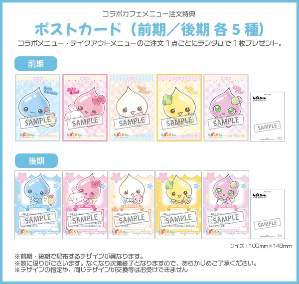 この限定しずくちゃんたちをイメージしたコラボメニューがお楽しみいただける他、メニューを注文の方には「しずくちゃん」カフェ限定のノベルティー「ポストカード」がランダムに1枚プレゼントされる。