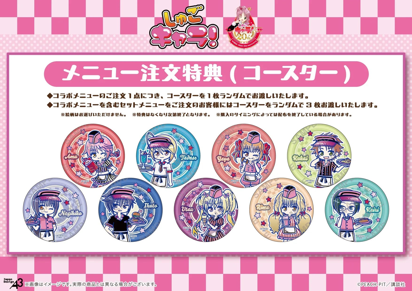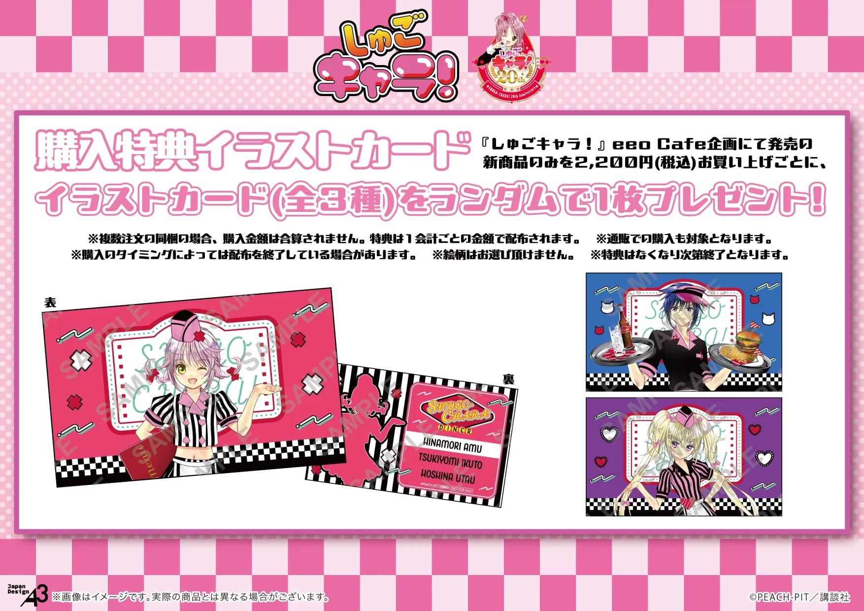 「しゅごキャラ! × eeo Cafe 池袋店」コラボにて、コラボメニューを1品注文ごとに特典として、描き下ろしイラストを使用した「コースター」がランダムに1枚プレゼントされる。