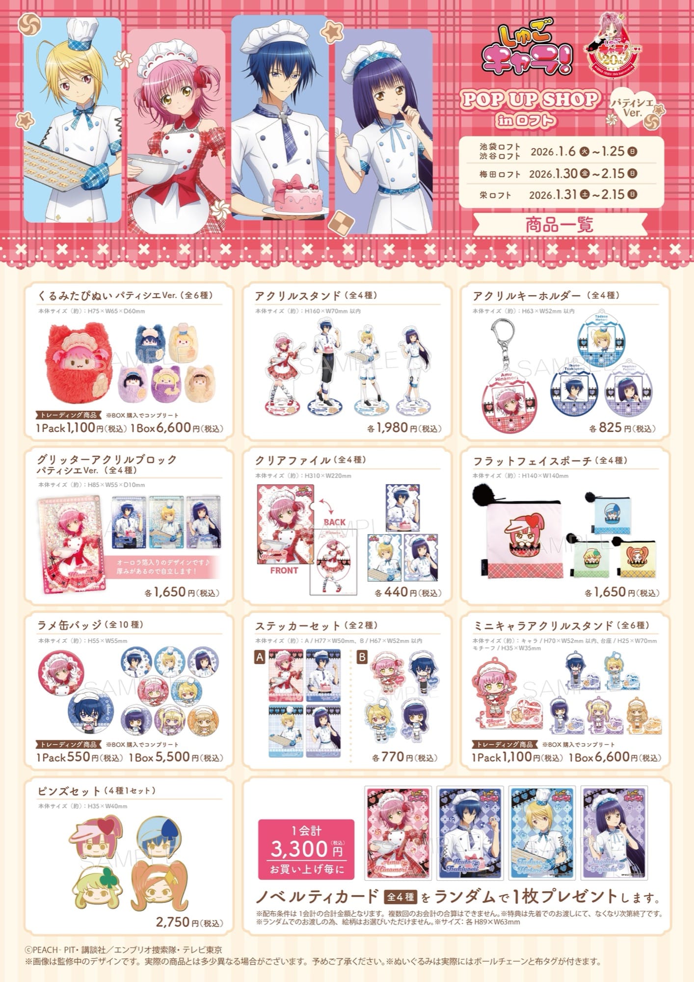 アニメ「しゅごキャラ!」ポップアップストアでは、パティシエ風衣装のイベント限定描き下ろしイラストを使用した新作グッズが多数販売される。