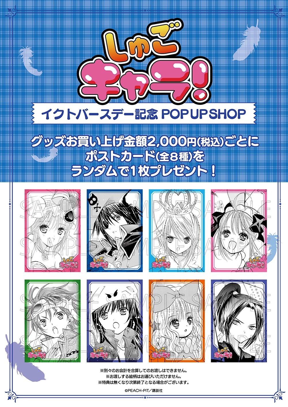 「しゅごキャラ!」ポップアップストアにて、お買い上げ金額2,000円(税込)ごとに「ポストカード(全8種)」をランダムで1枚、金額5,000円(税込)以上で「お祝いブロマイド」を1枚プレゼント!