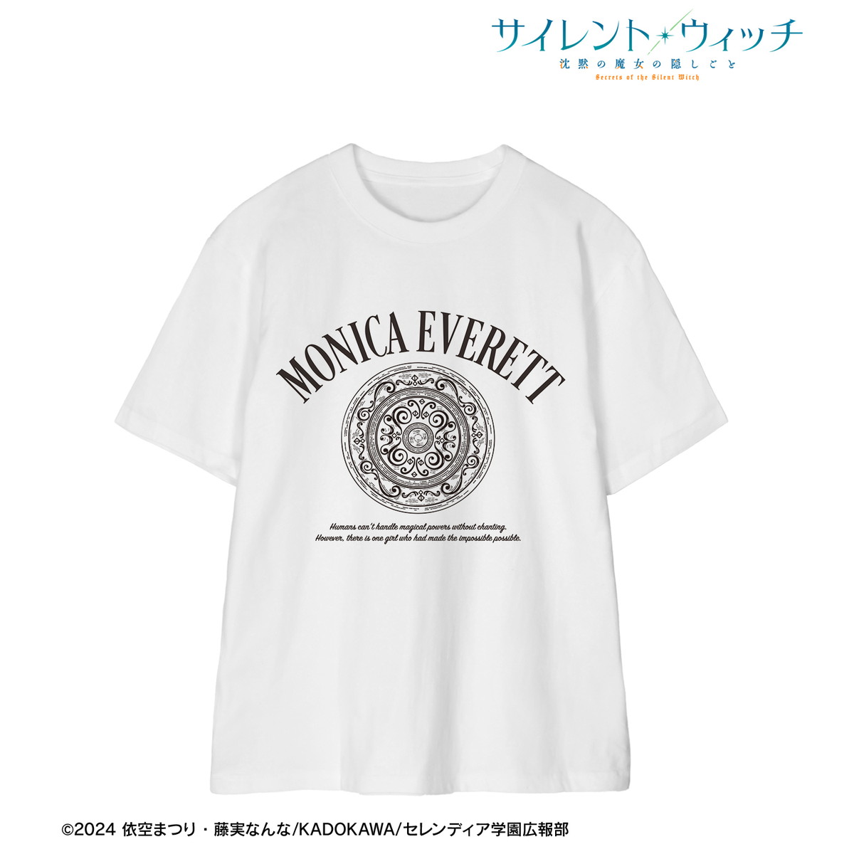モニカ・エヴァレットの名前とあらすじの英文をデザインした「魔法陣Tシャツ」も同時発売。 ユニセックス展開のため、お揃いコーデやギフトにいかが。