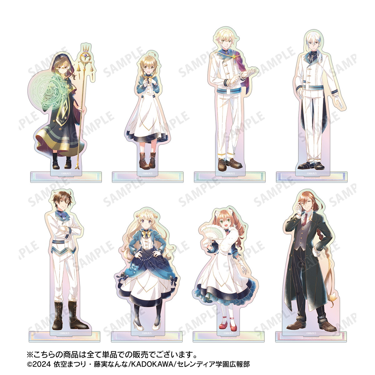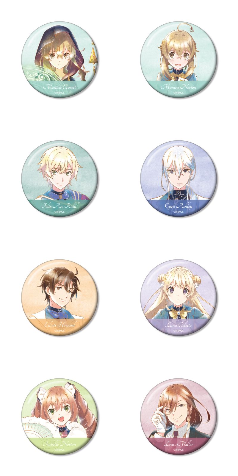 モニカ、フェリクス、シリル、エリオット、ラナ、イザベル、ルイスらの水彩風イラストを使用した「イラストカード」や「オーロラ缶バッジ」などトレーディング商品をはじめ、「オーロラアクリルスタンド」「マルチデスクマット」など全7種がラインナップ。