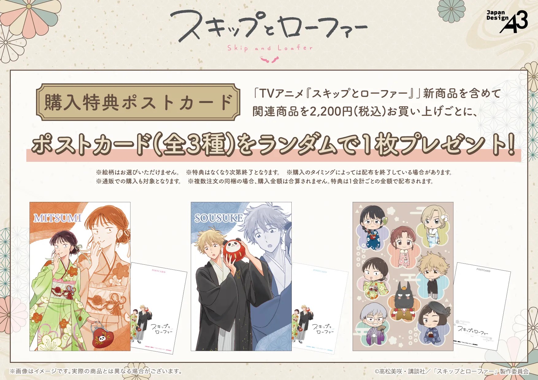 「スキップとローファー」ポップアップストアにて、関連商品を2,200円(税込)購入するごとに特典として「ポストカード (全3種)」をランダムに1枚プレゼント!
