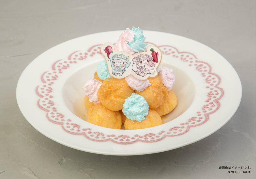 「おそろコーデ」のベビーグルーミーと汎用うさぎが、夢の世界へ誘う幻想的なクロカンブッシュタワー。ふんわりとろけるパステルカラーのホイップクリームをたっぷり使い、ホワイトチョコレートをトッピングしました。おそろ可愛い世界観を表現した、シェアにぴったりのフォトジェニックなデザートです。