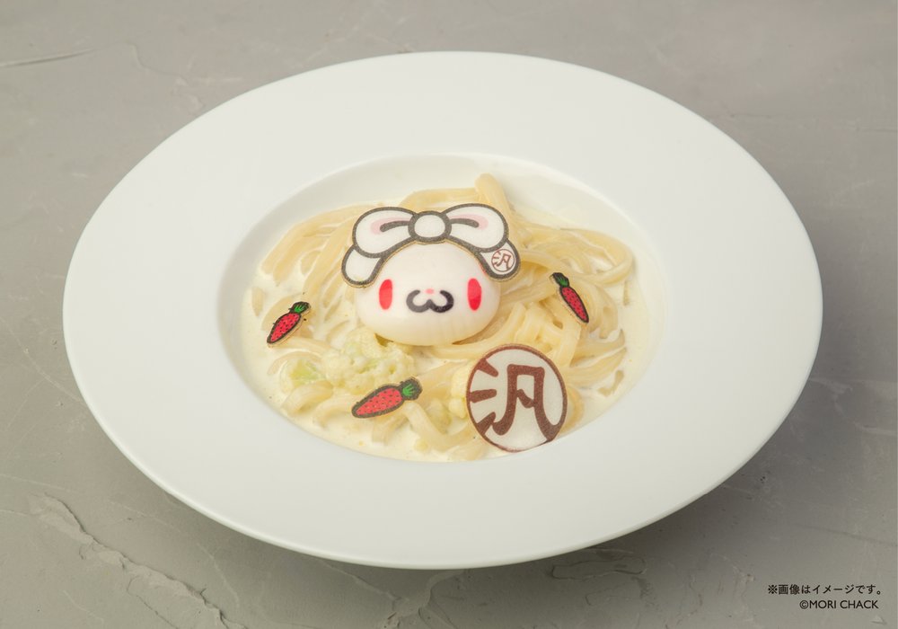 汎用うさぎとうどんが一体化⁈もちもちのうどんの上に、「汎」もなかと、好物のキャロットベリーをトッピング。半熟卵を添えた、キュートでフォトジェニックな一品です。