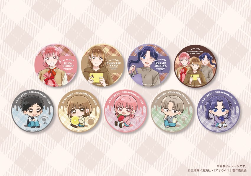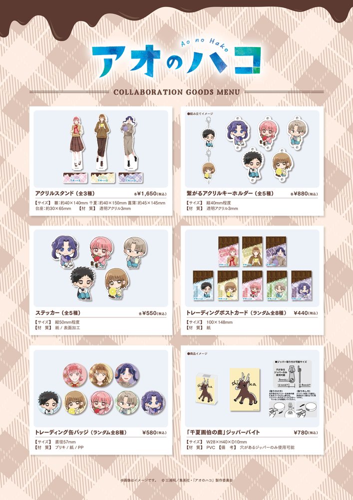 TVアニメ『アオのハコ』チョコレートモードカフェでは、大喜・千夏・雛・菖蒲・匡らキャラクターをイメージしたバレンタインらしいコラボメニューがお楽しみいただける他、ブラウンの衣装に身を包んだ私服姿の描き下ろしイラストや、制服姿の可愛らしいミニキャライラストを使用したコラボカフェ限定グッズが登場!