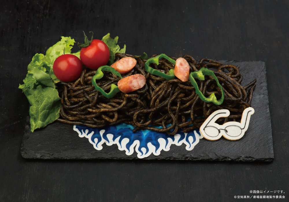 「これ、ナポリタン?」と思わずツッコミたくなる真っ黒ビジュアル。新八の描き下ろし衣装をモチーフに再現。見た目のインパクトとは裏腹に、食べやすい味わいに仕上げました。