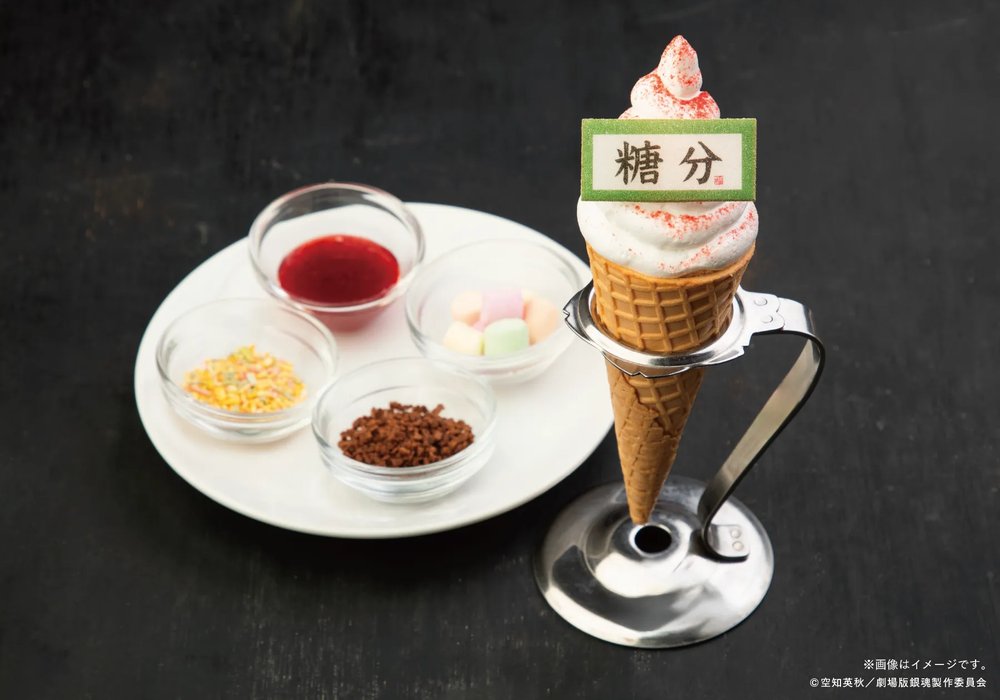 ソフトクリーム風の見た目からは想像できない、コーンの中はいちごづくしの甘党向けパフェ。4種類のトッピングで味の変化を楽しめます。銀時要素として糖分の掛け軸もなかを添え、甘さも遊びも詰め込んだ一品に仕上げました。