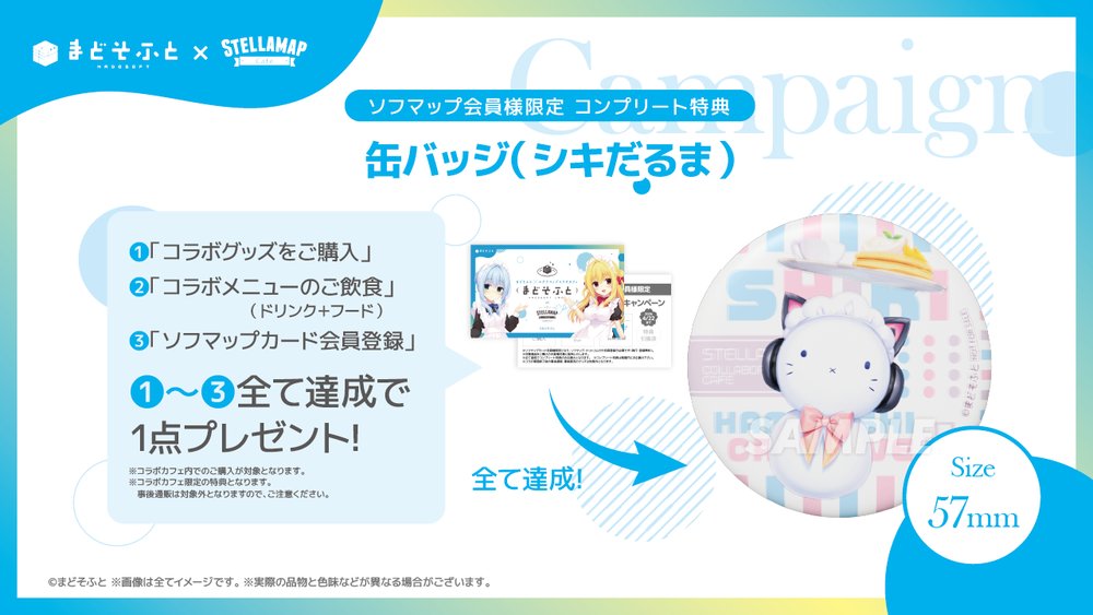 ①「コラボグッズをご購入」、②「コラボメニューのご飲食(ドリンク+フード)」、③「ソフマップカード会員登録」①~③全て達成で1点プレゼント!