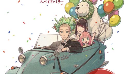 遠藤達哉先生のアニメ化記念イラストでは、ロイド・アーニャ・ヨル・ボンドの3人と1匹家族が、ロイドの車に乗って2022年のアニメ化をお祝いする様子が描かれている。