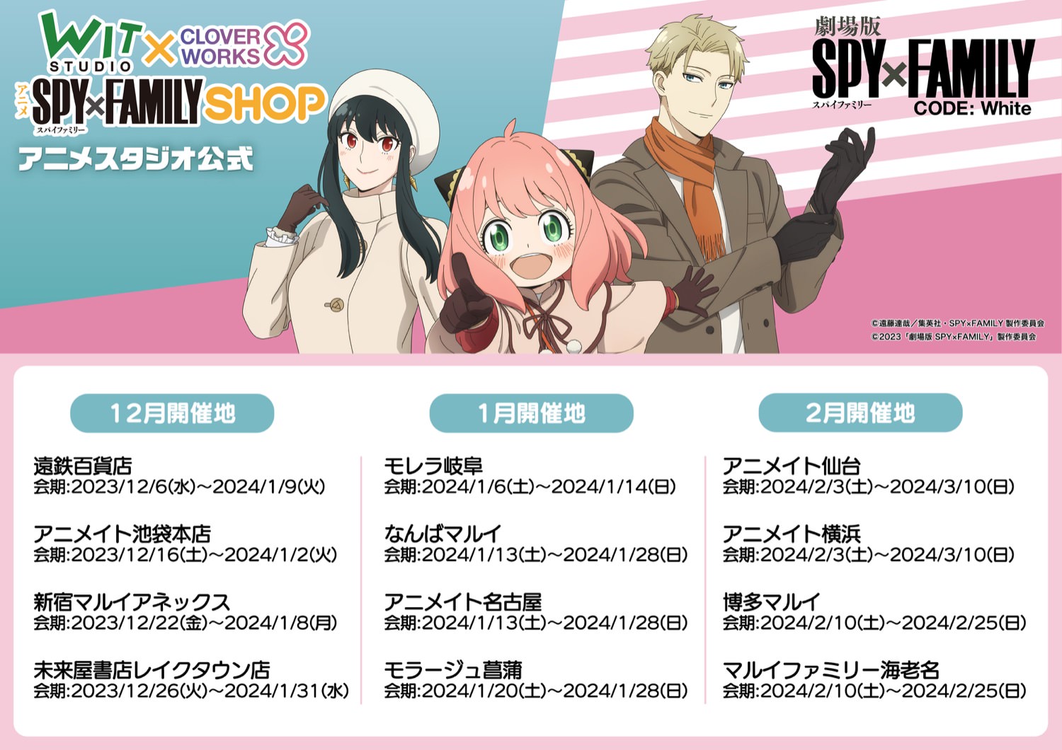 | 開催場所・期間 | ![]() ©2023「劇場版 SPY×FAMILY」製作委員会 ©遠藤達哉/集英社 |