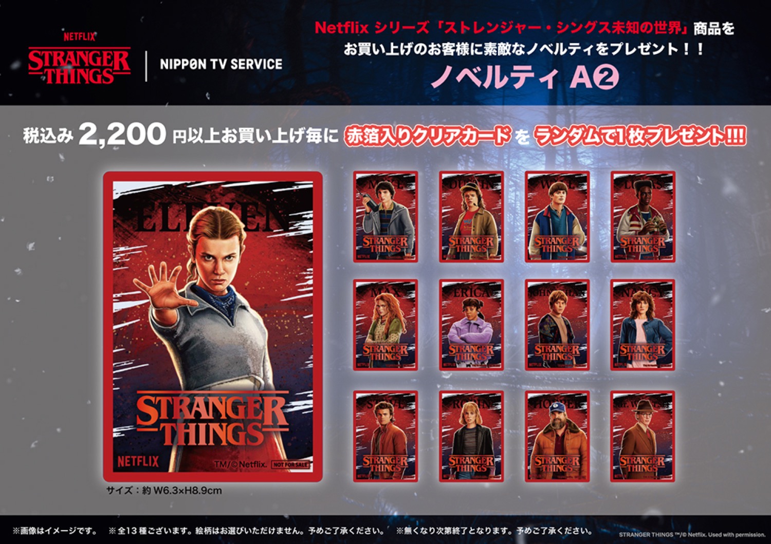 「ストレンジャー・シングス 未知の世界」ポップアップストアにて、グッズをお買い上げ2,200円(税込)ごとに特典として前半期間には「限定ポストカード 全5種」を、後半期間には「赤箔入りクリアカード 全13種」をランダムに1枚プレゼント!